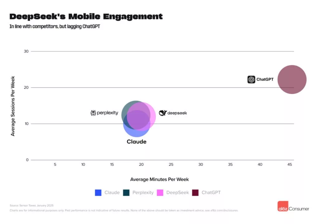 در این بین ChatGPT رقبای جدی نیز داشته است. اپلیکیشن DeepSeek توانسته ظرف تنها 10 روز به جایگاه دوم جهانی برسد و 15 درصد از کاربران موبایل ChatGPT را به خود جذب کند. با این حال، ChatGPT همچنان صدرنشین بیرقیب بازار است و بر اساس دادههای Similarweb، رتبه نخست بازدیدهای ماهانه وب و کاربران فعال موبایل را در اختیار دارد.