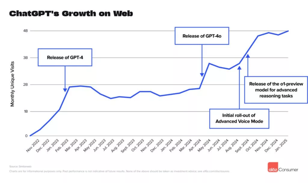 طبق گزارش جدیدی که توسط شرکت Andreessen Horowitz (a16z) منتشر شده، رشد اولیه ChatGPT بیشتر بهدلیل جذابیت یا همان کنجکاوی کاربران برای تجربه این فناوری نوظهور بوده، اما در ماههای اخیر، انتشار نسخههای جدید و قابلیتهای پیشرفته، عامل اصلی ادامه رشد آن بودهاند. معرفی GPT-4o با قابلیتهای چندوجهی در آوریل 2024 و سپس حالت پیشرفته Voice Mode در تابستان، از مهمترین عوامل جهش استفاده از ChatGPT بودهاند.