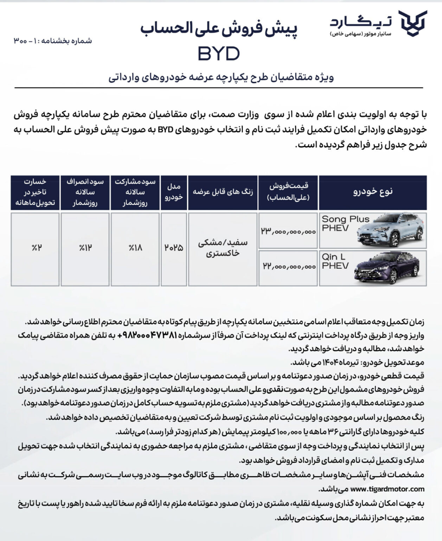 / عرضه خودروهای وارداتی از هفته آینده آغاز می شود و در این عرضه تیگارد موتور تنها شرکتی است که خودروهای BYD را به فروش می رساند.