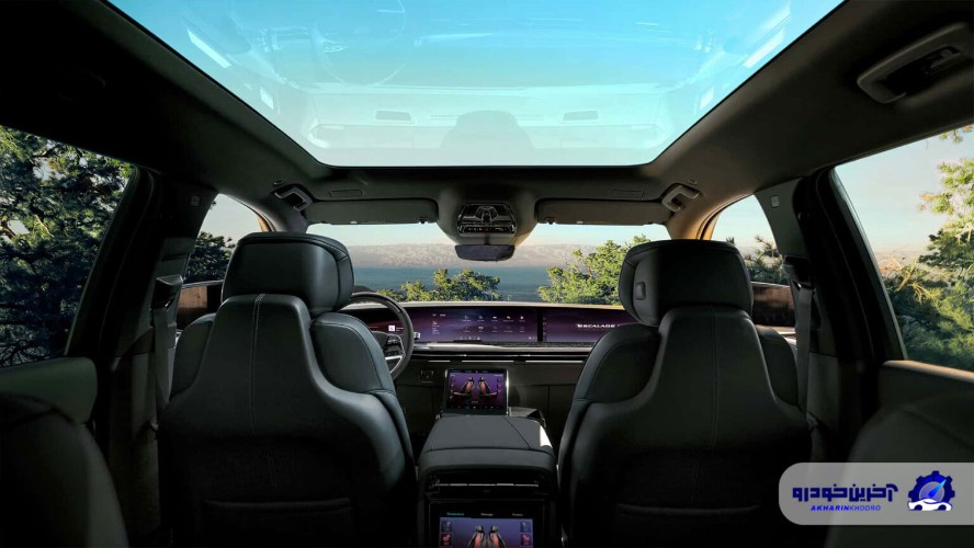 در داخل کابین، همچنان شاهد نمایشگر خمیده ۵۵ اینچی روی داشبورد هستیم. این نمایشگر غول پیکر اطلاعات مورد نیاز راننده و اطلاعات سیستم سرگرمی را به صورت یکپارچه نشان میدهد. از آنجایی که کادیلاک اسکالید IQL خودرویی بسیار لوکس است، سرنشینان ردیف دوم نیز نمایشگرهای اختصاصی خود را دارند تا در طول سفرها کاملاً سرگرم بمانند! اندازه این نمایشگرها با ۱۲.۶ اینچ برابر است. در صورت سفارش پکیج Executive Second Row، این نمایشگرها با یک سیستم صوتی مجهز به ۴۲ بلندگو جایگزین خواهند شد تا تجربه شنیداری بینظیری را رقم بزنند. ناگفته نماند در حالت استاندارد سیستم صوتی اسکالید IQL از طریق ۲۱ بلندگو موسیقیهای دلخواه راننده را پخش میکند.