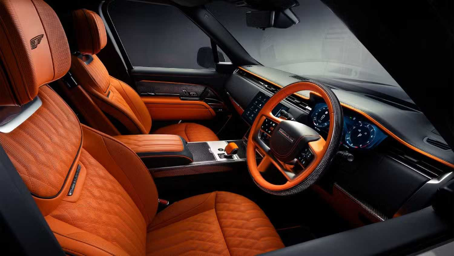کیت بدنه فیبر کربنی رنجرور ولوسیتی ادیشن اورفینچ شامل قوس چرخها و رکابهای جدید است تا ظاهری گیراتر را به ارمغان بیاورند. سپر جلوی جدید، دیفیوزر عقب متفاوت و کاپوت پف کرده با فیبر کربن نیز جزو دیگر تغییرات ظاهری شاسیبلند یاد شده خواهند بود. با ورود به داخل کابین نیز شاهد پوشش گسترده چرم خواهید بود. خریداران میتوانند رنگها، الگوها و تریم های گوناگونی را سفارش دهند اما خودرویی که مشاهده میکنید از رنگ نارنجی سود برده هرچند امکان انتخاب طرحهای مشکی و خاکستری و حتی زرد نیز وجود دارد.