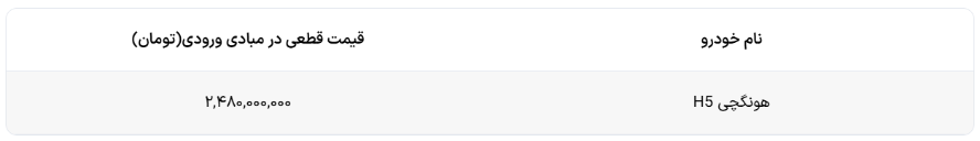 هونگچی H5 توسط بی ام کاز یکی از زیر مجموعه های گروه بهمن عرضه می شود. قیمت قطعی اعلامی برای این خودرو در مبادی ورودی ۲,۴۸۰,۰۰۰,۰۰۰ تومان اعلام شده است. برای محاسبه قیمت قطعی این خودرو باید قیمت قطعی و هزینه های عوارض قانونی پس از ترخیص را با هم جمع کرده. هزینه های عوارض قانونی پس از خروج شامل بیمه شخص ثالث، مالیات بر ارزش افزوده، هزینه های شماره گذاری، اسقاط خودروی فرسوده، کرایه حمل و…می شود.
