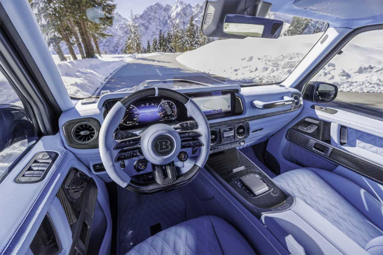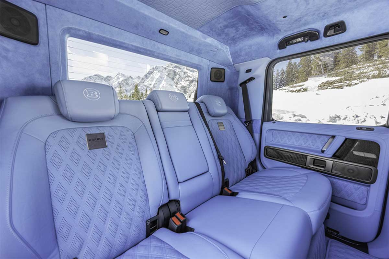پلههای جانبی برقی و مجهز نورپردازی، ورود و خروج را آسانتر کردهاند. درهای عقب تا ۹۰ درجه باز میشوند و کابین کاملاً با چرم آبیرنگ بازطراحی شده که با بدنه مشکی در تضاد است. دوخت ویژه روی بخش مرکزی صندلیها و قسمتهای داخلی درها دیده میشود. علاوه بر این، نشانهای برجسته «۷۷» (بهافتخار سال تأسیس برابوس در ۱۹۷۷) روی بخشهای مختلف حک شدهاند. استفاده از آلکانترا و تریم فیبر کربن با روکش براق، ماهیت لوکس این مرسدس G63 اصلاحشده را برجسته میکند. پینهای قفل در از آلومینیوم ساخته شدهاند و یک مجموعه نشانگر سقفی، سرعت، زمان و تاریخ را به سرنشینان عقب نمایش میدهد.