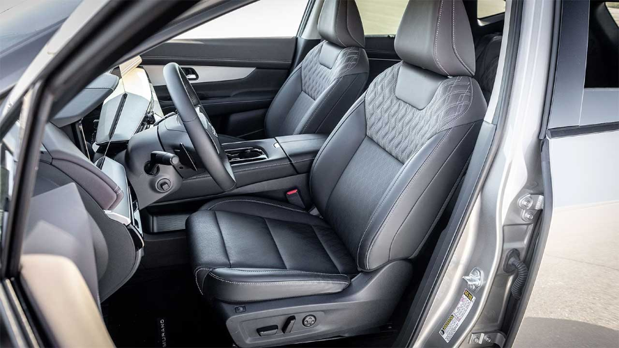 پنل چوبی داشبورد جذاب است، اما نوار پلاستیکی خاکستری-آبی که بالای دریچههای هوا و روی پنلهای درها امتداد دارد، کمتر ما را مجذوب کرد. این نوار بسته به نور و زمان روز تغییر رنگ میدهد که بیشتر از آنکه پویا باشد، حواس را پرت میکند است. استفاده از یک رنگ ثابت میتوانست کابین را یکپارچهتر و لوکستر نشان دهد. بااینحال، نیسان تلاش زیادی برای راحتی کابین مورانو ۲۰۲۵ کرده است. مدل پلاتینیوم ما مجهز به صندلیهای زیرو گراویتی در هر دو ردیف بود. آنچه واقعاً توجه ما را جلب کرد، صندلیهای جلوی ماساژوردار بود یعنی چیزی که در این کلاس از شاسیبلندها خیلی کم دیده میشود.