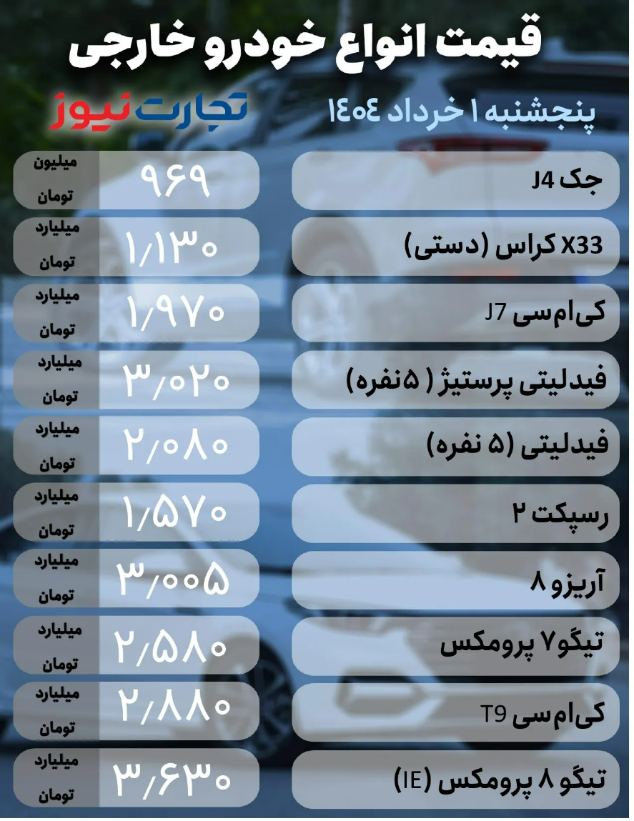 تجارت نیوز/ قیمت خودرو امروز 1 خرداد 1404 اعلام شد. بازار خودرو در ادامه روند صعودی روزهای اخیر، بار دیگر با افزایش قیمت همراه شد. شدت این افزایشها در محصولات داخلی ملموستر از خودروهای مونتاژی بوده است. با این حال، در بین مونتاژیهای بازار، محصولات شرکت مدیران خودرو بیشترین افزایش قیمت را به خود اختصاص دادهاند.