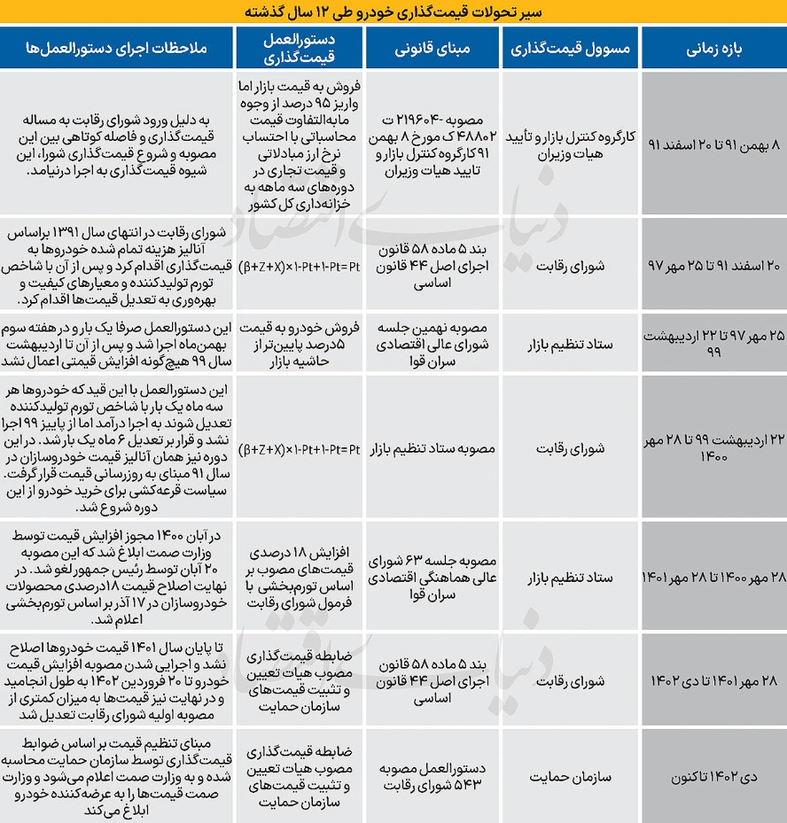 همانطور که عنوان شد در 12 سال گذشته قیمتگذاری خودرو همواره در اختیار نهادهای دولتی یا شبهدولتی بوده و سیاستهای دستوری عملا مانع از کارآیی اقتصادی صنعت خودرو و عدمبهرهمندی مصرفکننده از منافع رقابت و کیفیت شدهاند. در این زمینه مرکز پژوهشهای مجلس جدولی تهیه کرده بود که «دنیایاقتصاد» این جدول را تکمیل کرده است. طبق این جدول دوره قیمتگذاری به اواخر سال 91 بازمیگردد؛ سالی که «کارگروه کنترل بازار» با تایید هیات وزیران، مرجع قیمتگذاری بود. در آن زمان، مبنای محاسباتی فروش خودرو بر اساس نرخ ارز مرجع و میانگین قیمت سهماهه بازار آزاد انجام میشد. فرمول قیمتگذاری شفاف نبود، و بیش از هر چیز، سیاستگذاران در پی کنترل قیمتها بودند. با این حال به دلیل ورود شورای رقابت این شیوه قیمتگذاری در مدت کوتاهی اجرا شد.
