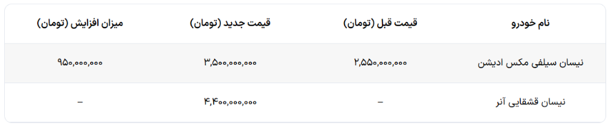 نامی خودرو پیشرو به عنوان واردکننده محصولات نیسان در دور جدید واردات، قیمت جدید دو خودرو سیلفی مکس ادیشن و نیسان قشقایی را با افزایش قابل توجه اعلام کرده است. البته پیش از این هم قیمت جدید برخی دیگر از خودروهای وارداتی با افزایش اعلام شده بود و پیش بینی می شود که تمام خودروهای وارداتی افزایش قیمت داشته باشند. بر اساس اعلام شرکت واردکننده، قیمت جدید نیسان قشقایی آنر 4 میلیارد و ۴۰۰ میلیون تومان محاسبه شده و قیمت جدید سدان سیلفی مکس ادیشن، ۳ میلیارد و ۵۰۰ میلیون تومان اعلام شده است. در جدول زیر می توانید میزان افزایش قیمت را مطالعه کنید :