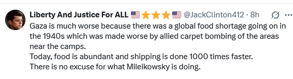 غزه بسیار بدتر است زیرا در دهه 1940 کمبود جهانی غذا وجود داشت که با بمباران گسترده متفقین در مناطق نزدیک اردوگاهها بدتر شد.امروزه، غذا فراوان است و انتقال آن می توانست هزار برابر سریعتر انجام شود.