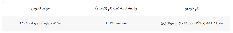 متقاضیان این طرح می توانند از ۶ تا ۱۰ خرداد نسبت به ایجاد حساب وکالتی اقدام کنند و سپس ثبت درخواست این خودرو را از ۷ تا ۱۱ خرداد به سایپا اعلام نمایند. با این پروژه سایپا 441P مونتاژی جایگزین چانگان CS55 پلاس خواهد شد.