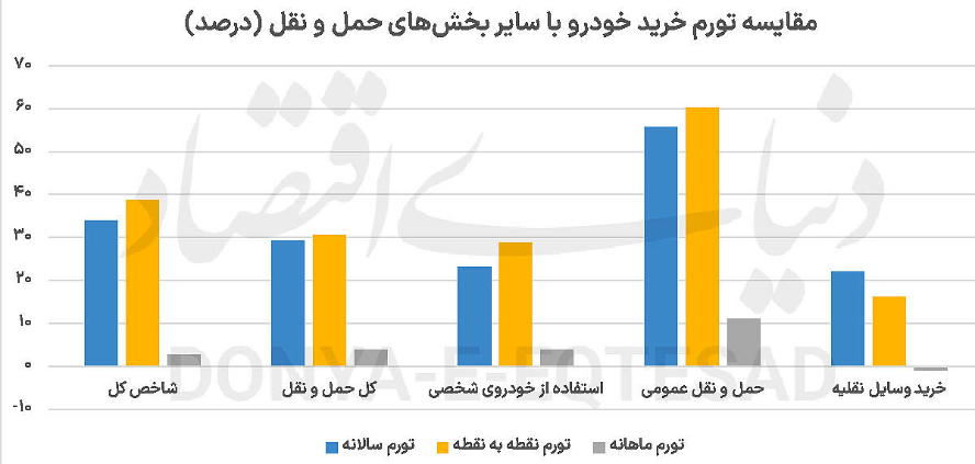 اما کاهش تورم ماهانه خرید وسایل نقلیه، لزوما به معنای کاهش هزینههای کلی خودرو برای خانوارها نیست. هزینههای جانبی خودرو مانند بیمه، تعمیرات و قطعات یدکی همچنان روندی افزایشی دارند. این شاخص که با عنوان تورم «استفاده از وسایل حملونقل شخصی» از آن یاد میشود تورم ماهانه ۳.۹درصد را تجربه کرده همچنین تورم نقطه به نقطه و سالانه آن به ترتیب به ۲۸.۹ و ۲۳.۲درصد رسیده است. به عبارت دیگر، حتی اگر قیمت خرید خودرو کاهش یابد، هزینههای نگهداری و استفاده از خودرو همچنان بالا باقی میماند.