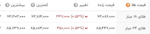 به گزارش آخرین خبر و به نقل از سایت شبکه اطلاعرسانی طلا، سکه و ارز نرخ طلا 18 عیار با کاهش 33 هزار تومانی به قیمت 6 میلیون و 408 هزار و 600 تومان رسید. سکه امامی با 580 هزار تومان کاهش با 72 میلیون و 610 هزار تومان داد و ستد شد. سکه بهار آزادی با کاهش 440 هزار تومانی 67 میلیون و 470 هزار تومان قیمتگذاری شد. نرخ نیم سکه و ربع سکه به ترتیب 41 میلیون و 660هزار تومان و 23 میلیون و 960 هزار تومان در تابلو اعلان قیمتها نمایان شد.