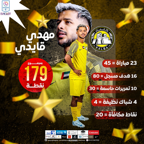 مهدی قائدی، مهاجم تیم ملی ایران از سوی فوتبالدوستان امارات در فوتبال فانتزی لیگ این کشور با کسب بیشترین امتیاز بهترین بازیکن فصل از نگاه مردمی انتخاب شد.قائدی به تنهایی در به ثمر رسیدن ۲۶ گل تاثیرگذار بود تا بهترین بازیکن فصل لیگ امارات انتخاب شود.