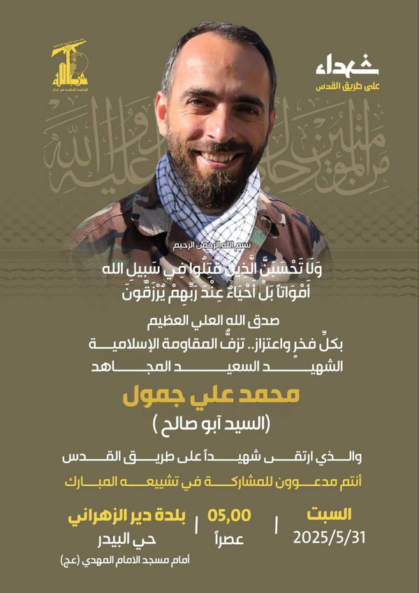حزبالله لبنان شهادت «محمد علی جمول» به دست رژیم صهیونیستی در شهرک دیرالزهرانی واقع در جنوب لبنان را تأیید کرد.