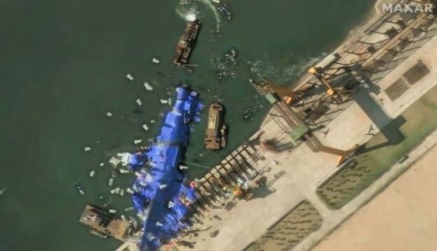 ایسنا/تصاویر جدید ماهوارهای نشان میدهند که کره شمالی اشیایی بالون شکل را در کنار کشتی ۵۰۰۰ تنی آسیب دیده خود که به یک طرف متمایل و تقریبا غرق شده است، مستقر کرده است.