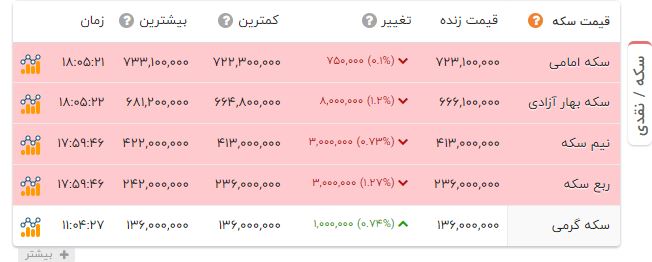 به گزارش آخرین خبر و به نقل از سایت شبکه اطلاعرسانی طلا، سکه و ارز، سکه با 75 هزار تومان کاهش قیمت، 72 میلیون 310 هزار تومان داد و ستد شد.
