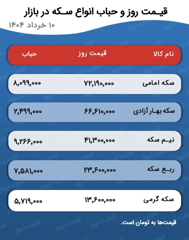 قیمت سکه امامی شنبه ۱۰ خرداد با کاهش ۱۹۵ هزار تومانی روی رقم ۷۲ میلیون و ۱۹۰ هزار تومانی ایستاد. قیمت سکه بهار آزادی با کاهش ۸۰۰ هزار تومانی روی رقم ۶۶ میلیون و ۶۱۰ هزار تومان معامله شد.