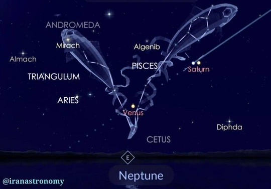 سیاره ناهید در صورت فلکی ماهی و سیارات کیوان (Saturn) و نپتون بالاتر از آن در همین صورت فلکی - بامداد یکشنبه ۱۱ خرداد