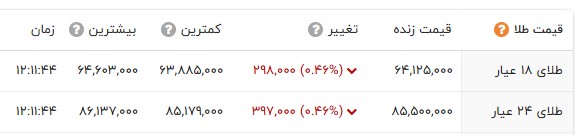در بازار نرخ هر گرم طلای 18 عیار با 29 هزار تومان کاهش و با نرخ شش میلیون و 412 هزار تومان در بازار طلا معامله شد. سکه امامی با 585 هزار تومان کاهش به 71 میلیون و 505 هزار تومان قیمت گذاری شد. سکه بهار آزادی با 35 هزار تومان کاهش به 66 میلیون و 580 هزار تومان رسید. نرخ نیم سکه و ربع سکه به ترتیب 41 میلیون و 300 هزار تومان و 23 میلیون و 500 هزار تومان در تابلو اعلان قیمتها نمایان شد.