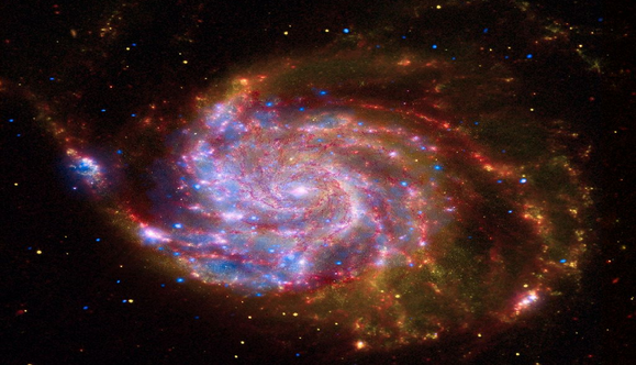 این تصویری از «کهکشان فرفره»( Pinwheel galaxy) است. برای مشاهده این کهکشان، از دیدگاه «فوتون» یا نور، یک ستاره درون کهکشان آن را ساطع کرده است و سپس یک پیکسل در دوربین تلسکوپ آن را جذب کرده است و چون فضا فشرده است، برای «فوتون» این سفر بینهایت سریع و کوتاه بوده است.