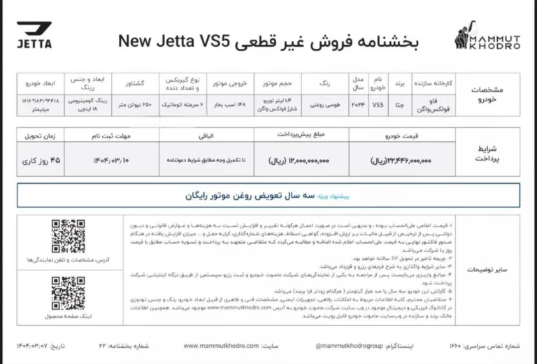 شرکت ماموت خودرو به عنوان عرضه کننده محصولات برند جتا به تازگی شرایط فروش جدیدی را با قیمت غیر قطعی برای نیو جتا VS5 و VS7 در نظر گرفته است.