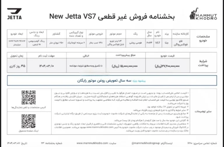 به گزارش پایگاه خبری آخرین خودرو، در این شرایط فروش نیو جتا VS5 و VS7 به ترتیب قرار است با قیمت غیر قطعی ۲۲,۴۴۶,۰۰۰,۰۰۰ ریال و ۲۷,۲۰۰,۰۰۰,۰۰۰ ریال به فروش برسد که متقاضیان می بایست در مرحله اول برای نیو جتا VS5، ۱۲,۰۰۰,۰۰۰,۰۰۰ ریال و برای نیو جتا VS7، ۱۵,۰۰۰,۰۰۰,۰۰۰ ریال را به حساب شرکت واریز نمایند. لازم به ذکر است که متقاضیان می بایست مابقی مبلغ را مطابق شرایط دعوتنامه پرداخت نمایند. بد نیست بدانید که موعد تحویل نیو جتا VS5 و VS7 در این طرح ۴۵ روز کاری اعلام شده و جریمه تاخیر در تحویل خودرو ۱۲ درصد به صورت سالیانه خواهد بود.