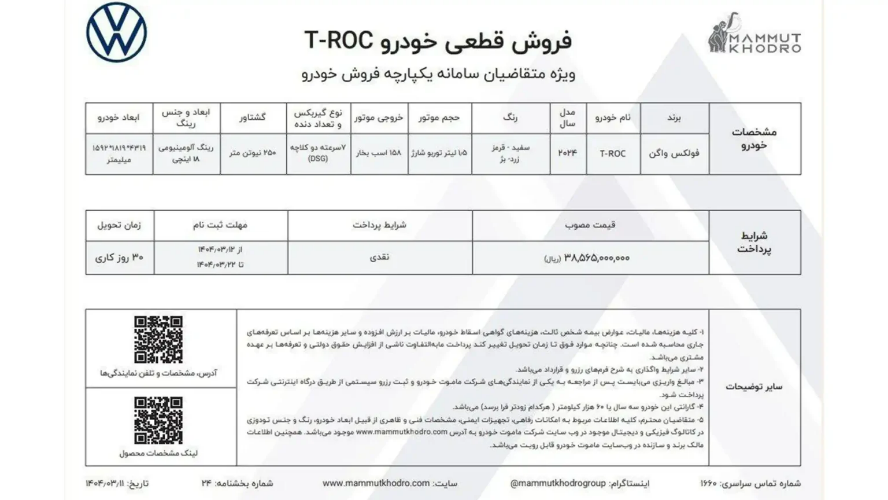 بر اساس بخشنامه فروش منتشر شده توسط ماموت خودرو، متقاضیانی که برای خرید فولکس واگن تیراک ثبت اولویت شده اند می توانند از تاریخ ۱۲ تا ۲۲ خرداد از طریق نمایندگی های رسمی ماموت خودرو مبلغ مصوب خودرو را پرداخت کرده و پس از ۳۰ روز کاری خودروی خود را تحویل بگیرند. نکته قابل توجه این است که کراس اوور وارداتی ماموت در بخشنامه جدید با قیمت ۳ میلیارد و ۸۵۶ میلیون و ۵۰۰ هزار تومان به عرضه می رسد و این یعنی افزایش قیمت ۹۱۱ میلیون تومانی را نسبت به قبل برای تیراک داشته ایم. در جدول زیر می توانید قیمت جدید و میزان افزایش قیمت را مطالعه کنید :