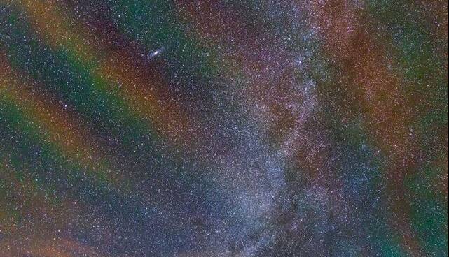 از میان این تابش هوا، یک آسمان تماشایی دیده میشود. نوار مرکزی کهکشان راه شیری در مرکز عکس امتداد یافته و «کهکشان آندرومدا»(Andromeda Galaxy) نزدیک بالا و سمت چپ عکس قابل مشاهده است.