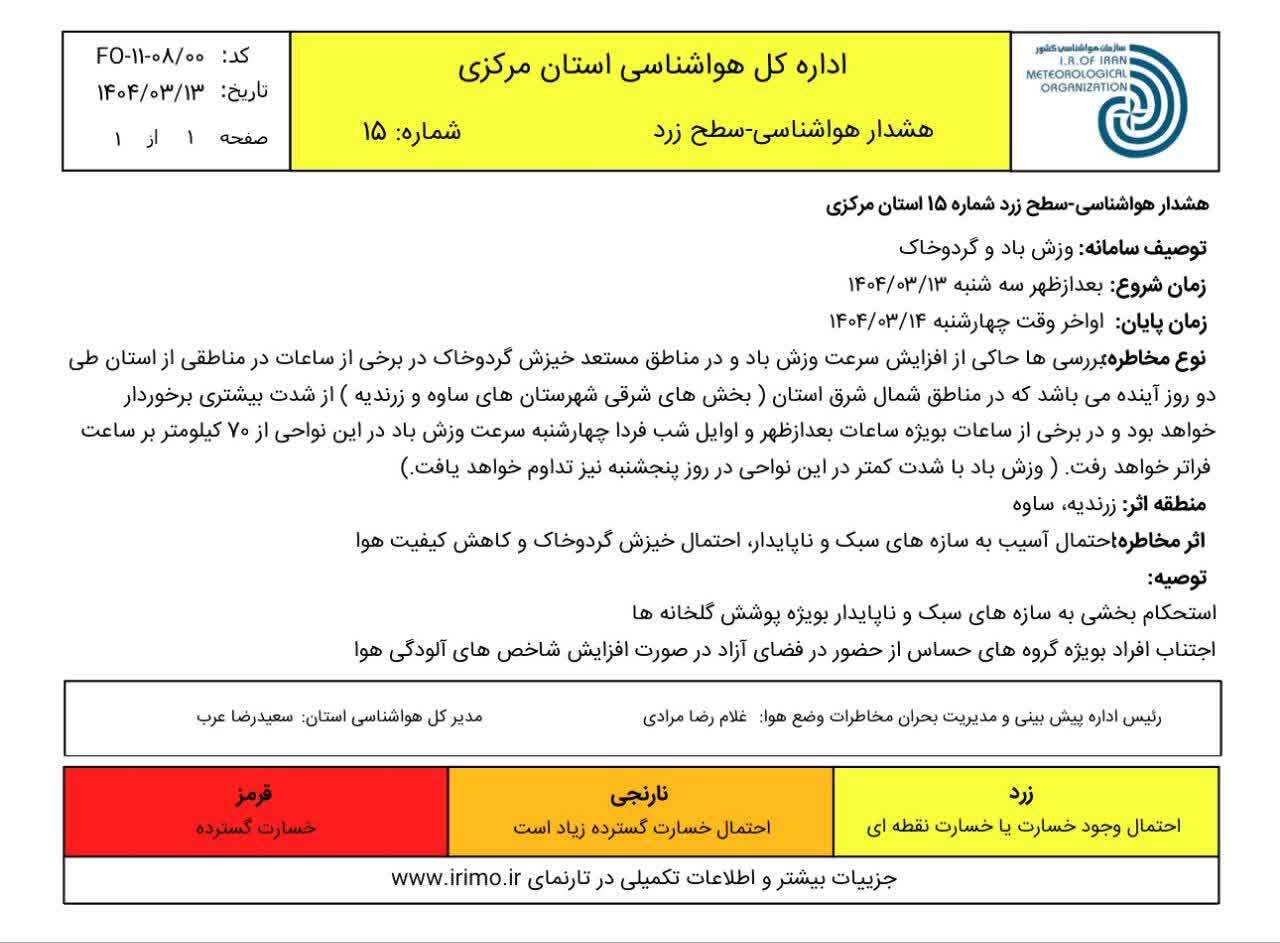 هشدار افزایش سرعت وزش باد در استان مرکزی