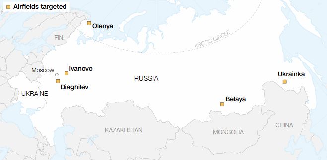 این حملات چهار پایگاه هوایی در دل روسیه را هدف قرار دادند که دورترین آن یعنی پایگاه «بِلایا» واقع در منطقه «ایرکوتسک»، حدود 4500 کیلومتر از مرز اوکراین با روسیه فاصله دارد.