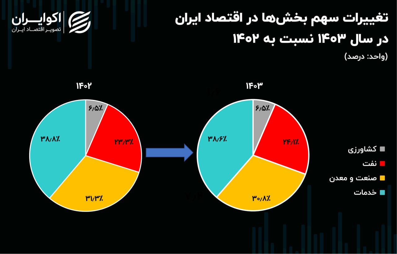 از سوی دیگر به دلیل عملکرد نامساعد بخشهای خدمات و صنعت، سهم بخش نفت از ۲۳.۳ درصد در سال ۱۴۰۲ به حدود ۲۴.۱ درصد در سال ۱۴۰۳ افزایش یافته است. افزایشی که در نهایت نشان میدهد بخش نفت وزن زیادی در پیشبرد رشد اقتصادی و توسعه در ایران ایفا میکند.