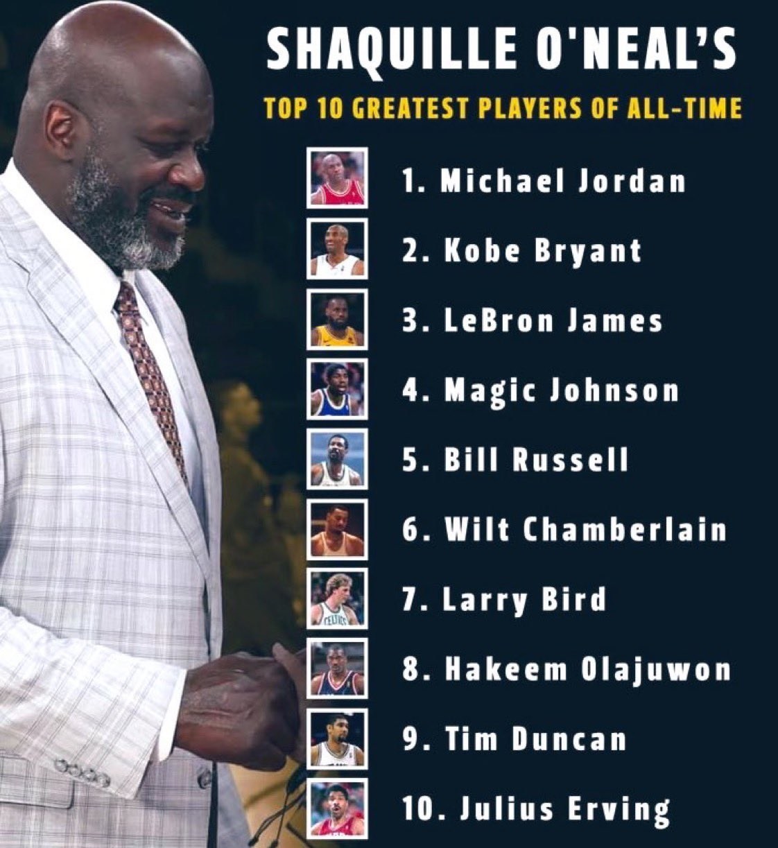 شکیل اونیل اسطوره بسکتبال آمریکا و تیمهایی مثل لسآنجلس لیکرز و میامی هیت، بازیکن برتر تاریخ NBA را از دیدگاه خود به شرح زیر معرفی کرد: