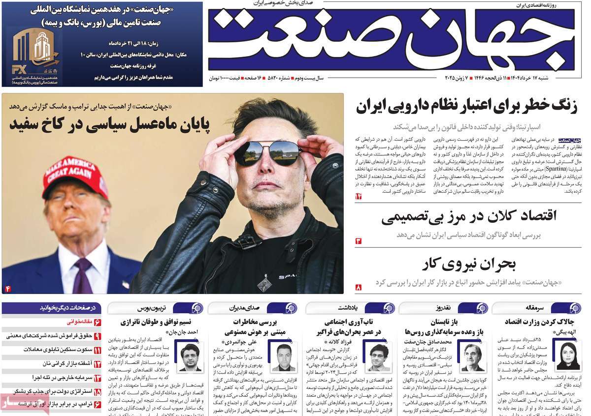صفحه اول روزنامه جهان صنعت شنبه ۱۷ خرداد
