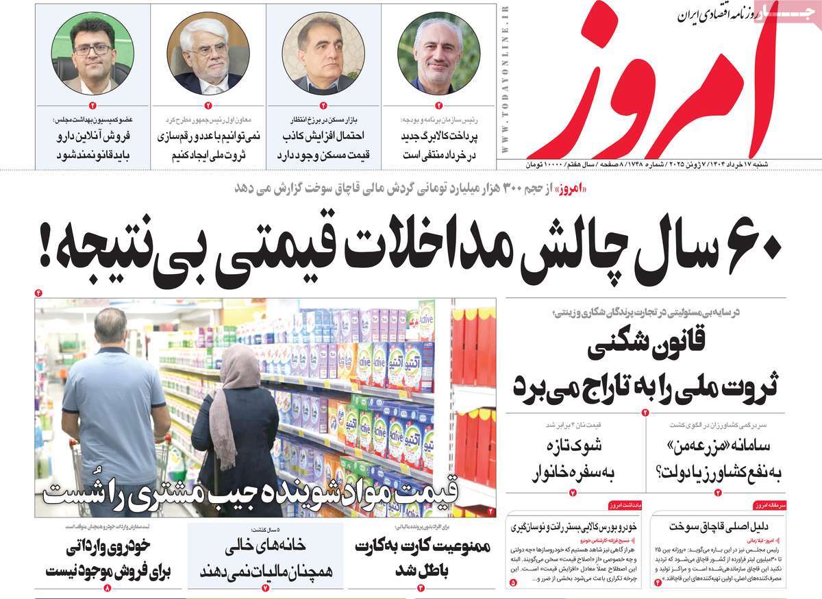 صفحه اول روزنامه امروز شنبه ۱۷ خرداد