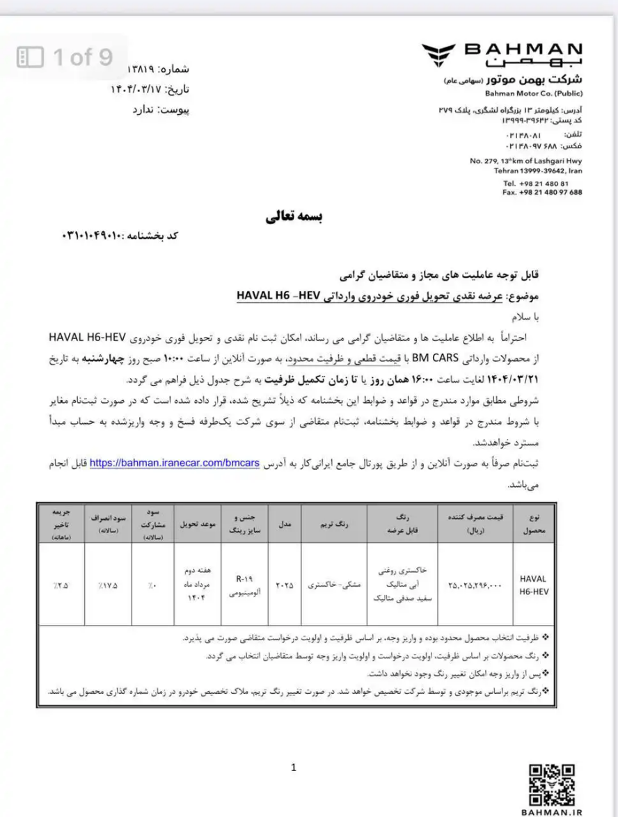 بر اساس بخشنامه فروش منتشر شده شرکت بهمن موتور شرایط فروش خودروی هاوال H6 را با قیمت قطعی دو میلیارد و ۵۰۲ میلیون تومان و موعد تحویل هفته دوم مرداد ۱۴۰۴ اعلام کرد. متقاضیان می توانند از ساعت ۱۰ صبح روز چهارشنبه مورخ ۲۱ خرداد ماه لغایت ساعت ۱۶همان روز با مراجعه به سایت گروه بهمن نسبت به ثبت نام اقدام نمایند.