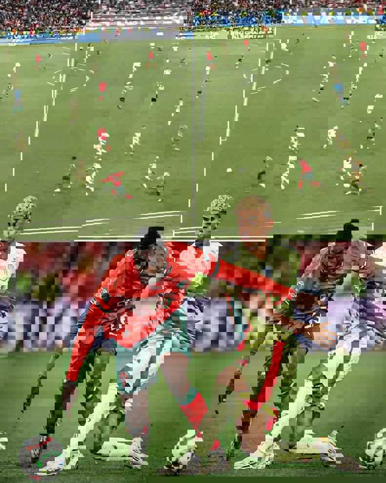 در نیمه اول، کریستیانو رونالدو دو بار با تجربهاش توپ را از یامال گرفت؛ صحنههایی که برای جوانی ۱۷ ساله قطعاً سنگین و تلخ بود. از سمت دیگر، نونو مندس بارها در نبردهای یکبهیک موفق عمل کرد و چند مرتبه یامال را جا گذاشت و از سمت چپ برای پرتغال موقعیتسازی کرد؛ از جمله در صحنه گل دوم.