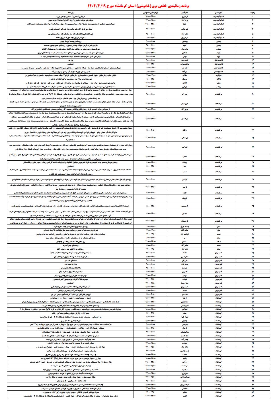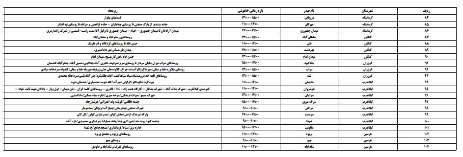جدول زمانی قطع برق استان کرمانشاه در روز ۱۹ خرداد