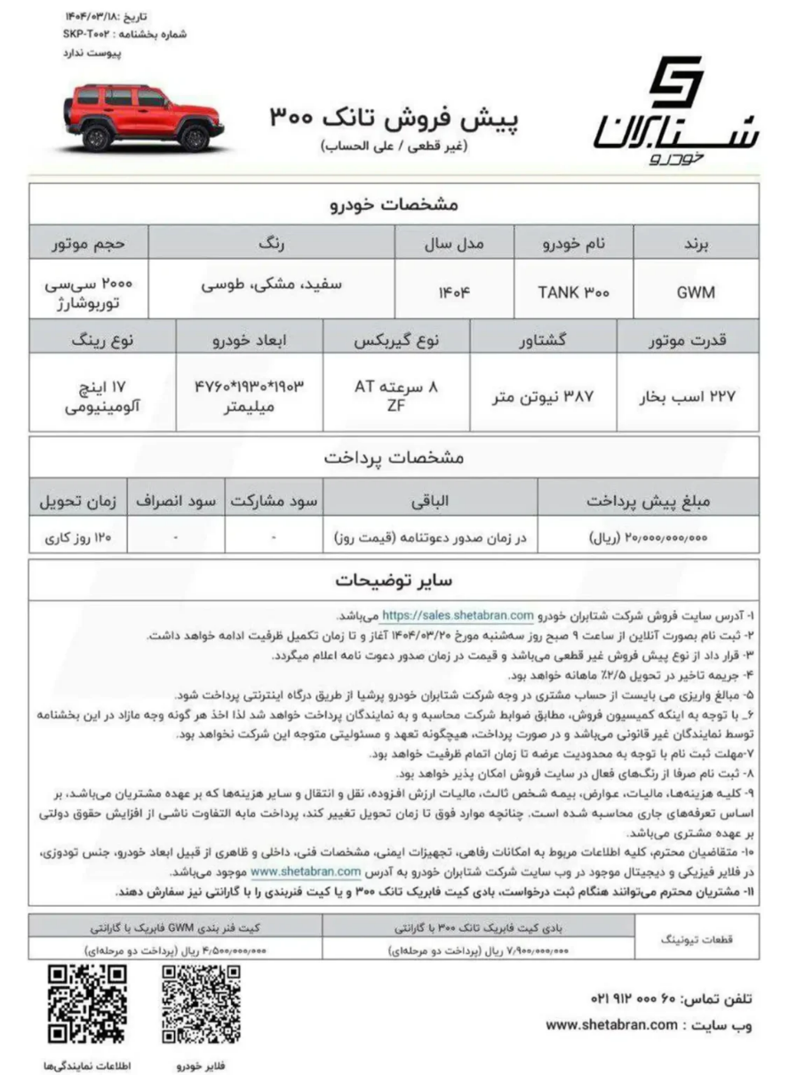 شرکت شتابران خودرو عرضه کننده محصولات تانک شرایط پیش فروش شاسی بلند تانک ۳۰۰ را ویژه خرداد ماه ۱۴۰۴ را اعلام کرد. متقاضیانی که تمایل به ثبت نام در پیش فروش تانک ۳۰۰ راه دارند می تواند از ساعت ۹ روز ۲۰ خرداد ماه نسبت به ثبت نام این محصول اقدام نمایند، این شرایط فروش تا زمان تکمیل ظرفیت ادامه خواهد داشت. قیمت این خودرو به صورت غیر قطعی بوده و مشتری در ابتدا باید ۲,۰۰۰,۰۰۰,۰۰۰ تومان پرداخت نماید، الباقی آن در زمان صدور دعوت نامه اعلام می شود. تانک ۳۰۰ یک SUV سایز متوسط است که از سال ۲۰۲۰ بر اساس پلتفرم GWM TANK روی خط تولید رفته و به لحاظ فنی در سه نسخه بنزینی، هایبرید خفیف و هایبرید عرضه شده است.