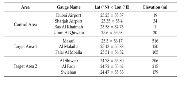 برای تایید یافتههای آماری، ارزیابی میدانی بر پایه رادارهای هواشناسی بهویژه رادار داپلر و رادار قطبشی صورت گرفت. این ابزارها قادرند در زمان واقعی، اطلاعاتی دقیق درباره خواص میکروفیزیکی، دینامیکی و ترمودینامیکی ابرها از جمله حجم، جرم، پوشش منطقه، طول عمر، ارتفاع و میزان بارش قابل استخراج ارائه دهند. در این بخش، ویژگیهای ۶۵ مورد طوفان بارورسازیشده با ۸۷ مورد طوفان غیربارورسازی مقایسه شد. یافتهها نشان داد که تنها ۱۵ تا ۲۵ دقیقه پس از بارورسازی، بهبودهای قابل توجهی در ساختار و شدت ابرهای بارورشده ایجاد شده است.مشخصات ایستگاههای هدف و کنترل آزمایشهای بارورسازی کشور امارات