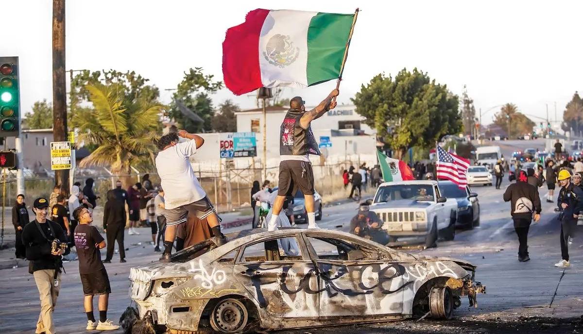 در نقطه مقابل، برخی معترضان پرچم مکزیک را به دست میگرفتند و بعضی از آنان نیز صورت خود را با چفیههای فلسطینی و ماسک میپوشاندند. آنها با آتش زدن حلقههای لاستیک، خودرو و استفاده از وسایل دیگر خیابانها را مسدود کردند. محور اصلی اعتراض همه آنان، سیاستهای مهاجرتی ترامپ است.