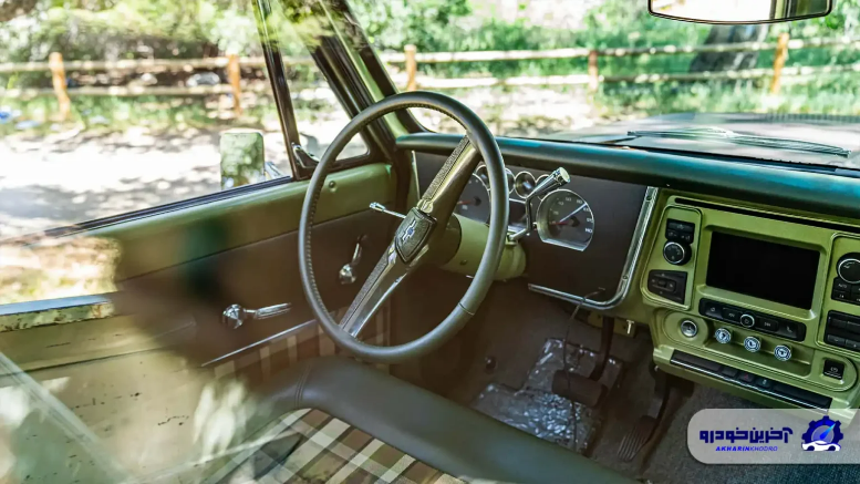 با ورود به کابین، دیگر خبری از حس و حال یک خودروی قدیمی نیست. داشبورد باز طراحی شده و سفارشی این پیکاپ شامل یک صفحه نمایش لمسی با دوربین دنده عقب، سیستم صوتی پیشرفته، نشان دهنده های مدرن و دیگر امکانات رفاهی روز میشود. صندلی نیمکتی هم با چرم دستدوز و پارچه پشمی شطرنجی پوشیده شده تا ضمن حفظ حس کلاسیک، لوکس و با کیفیت نیز باشد.