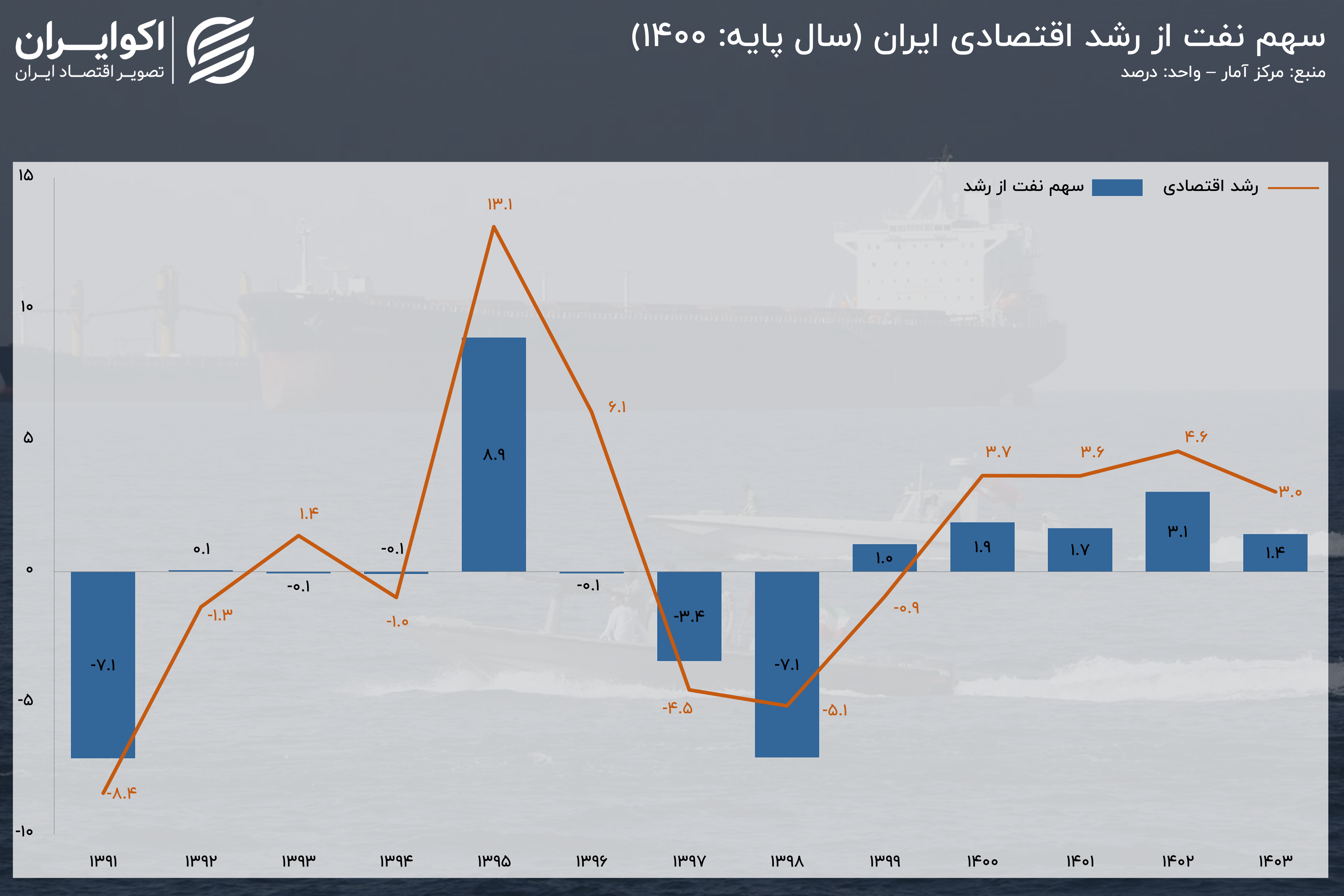 با این حال، روند و رفتار کلی در سالهای بعد نیز بر این اساس بوده که نفت نسبت به سایر بخشهای اقتصاد سهم بالاتری از رشد اقتصادی داشته است. برای مثال در سال 1402 از رشد اقتصادی 4.5 درصدی، 3 واحد درصد سهم نفت بود؛ یا در سال گذشته از رشد 3 درصدی کل اقتصاد، 1.4 درصد را نفت ایجاد کرده بود. نکته قابل توجه این است که در صورت حذف نفت از اقتصاد حتی رشد غیرنفتی هم به دلیل وابستگی شدید صنایع ایران به این طلای سیاه کاهش مییابد. به عبارت دیگر، صنعت در ایران همچنان تا حد زیادی وابسته به نفت و تولیدات نفتی است و اگر این وابستگی در محاسبات لحاظ شود، سهم بخش غیرنفتی هم در رشد کمرنگ میشود.