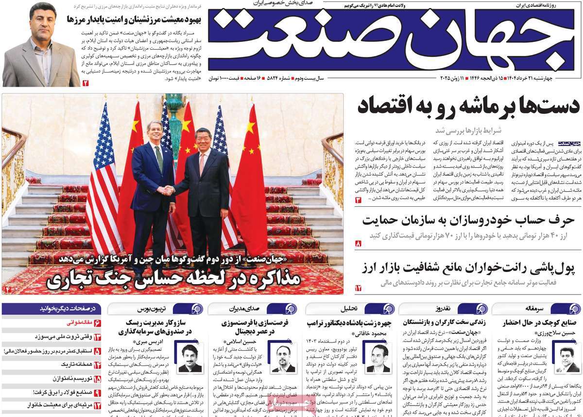 صفحه اول روزنامه جهان صنعت چهارشنبه ۲۱ خرداد