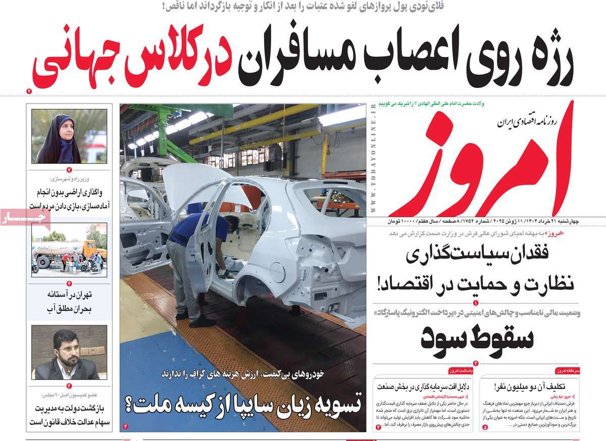 صفحه اول روزنامه امروز چهارشنبه ۲۱ خرداد