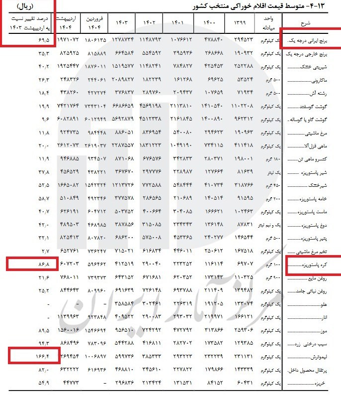 مرکز آمار ایران متوسط قیمت اقلام خوراکی منتخب کشور را اعلام کرد.
