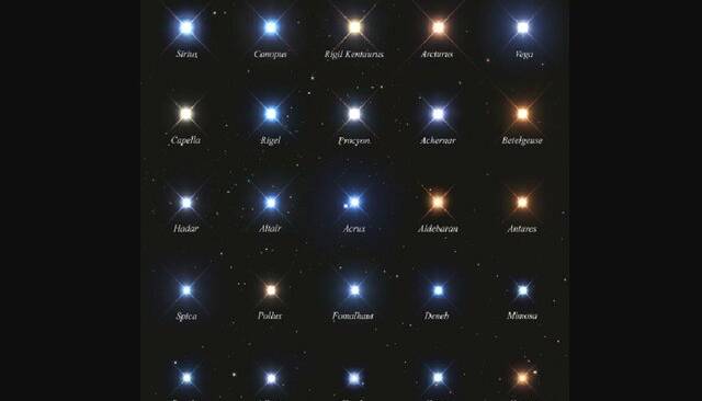 در این عکس ثبتشده با رنگ واقعی، ۲۵ ستاره درخشان آسمان شب که در حال حاضر توسط انسانها دیده میشوند، به همراه نامهای تعیینشده توسط اتحادیه بینالمللی نجوم نمایش داده شدهاند. برخی از نامها معانی جالبی دارند؛ از جمله «سیریوس»(Sirius) به معنای سوزاننده در لاتین، «وگا»(Vega) به معنای در حال فرود آمدن در عربی و «آنتارس»(Antares) به معنای رقیب مریخ در یونانی. احتمالاً شما با نام حداقل یک ستاره که برای قرار گرفتن در این فهرست بسیار کمنور است، آشنا هستید. این ستاره، «پولاریس»(Polaris) یا ستاره قطبی است.