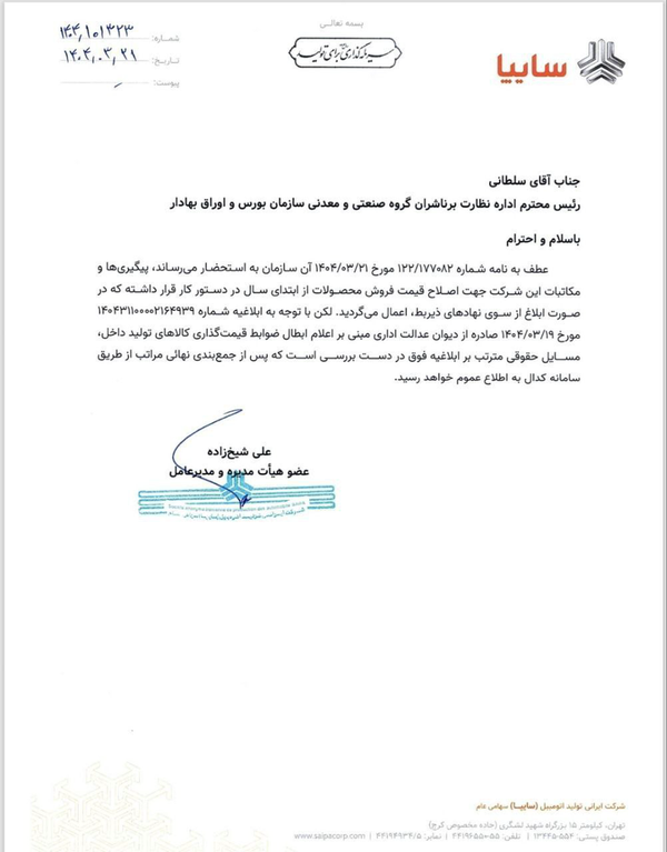 در این نامه آمده است: عطف به نامه شماره ۱۲۲/۱۷۷۰۸۲ مورخ ۱۴۰۴/۰۳/۲۱ آن سازمان به استحضار میرساند، پیگیری ها و مکاتبات این شرکت جهت اصلاح قیمت فروش محصولات از ابتدای سال در دستور کار قرار داشته که در صورت ابلاغ از سوی نهادهای ذیربط اعمال میگردید لکن با توجه به ابلاغیه شماره ۱۴۰۴۳۱۱۰۰۰۰۲۱۶۴۹۳۹ مورخ ۱۴۰۴/۰۳/۱۹ صادره از دیوان عدالت اداری مبنی بر اعلام ایطال ضوابط قیمت گذاری کالاهای تولید داخل مسایل حقوقی مترتب بر ابلاغیه فوق در دست بررسی است که پس از جمع بندی نهائی مراتب از طریق سامانه کدال به اطلاع عموم خواهد رسید.