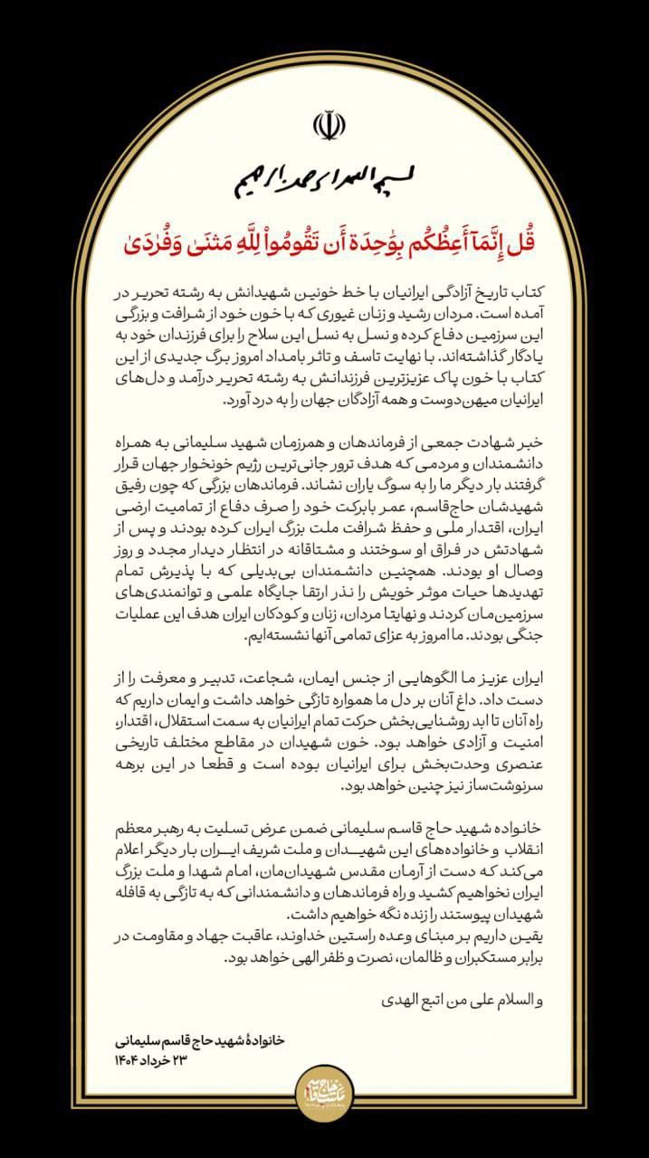 پیام تسلیت خانواده شهید حاج قاسم سلیمانی در پی شهادت جمعی از فرماندهان سپاه