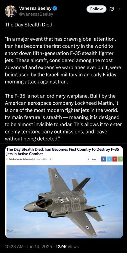 آخرین خبر/ ونسا بلی، خبرنگار مشهور بریتانیایی: در یک رویداد بزرگ که توجه جهانی را به خود جلب کرده، ایران به اولین کشور در جهان تبدیل شده که جتهای جنگنده رادارگریز نسل پنجم اف-۳۵ را سرنگون کرده.