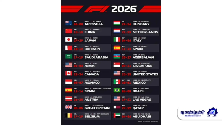 تقویم کامل مسابقات فرمول یک ۲۰۲۶ را میتوانید در ادامه مشاهده کنید: