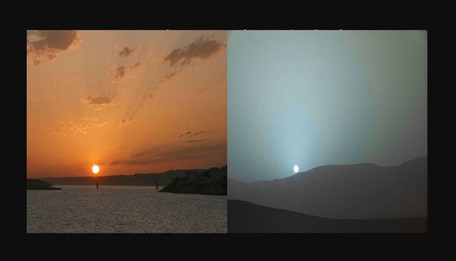 غروب خورشید از مریخ با غروب خورشید از زمین متفاوت به نظر میرسد. برای مقایسه، دو عکس از خورشید هنگام غروب منتشر شده که یکی از زمین و دیگری از مریخ گرفته شده است.